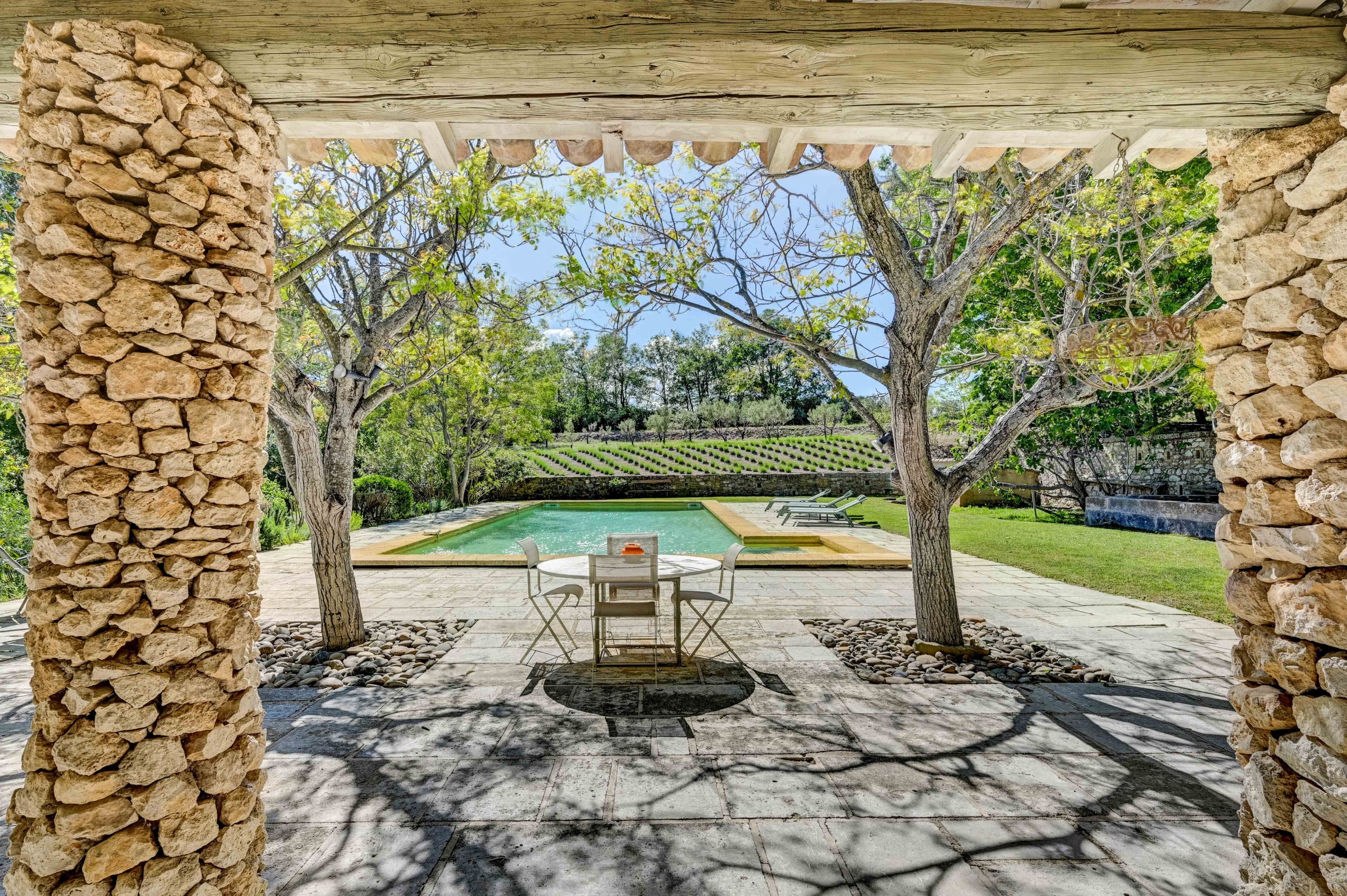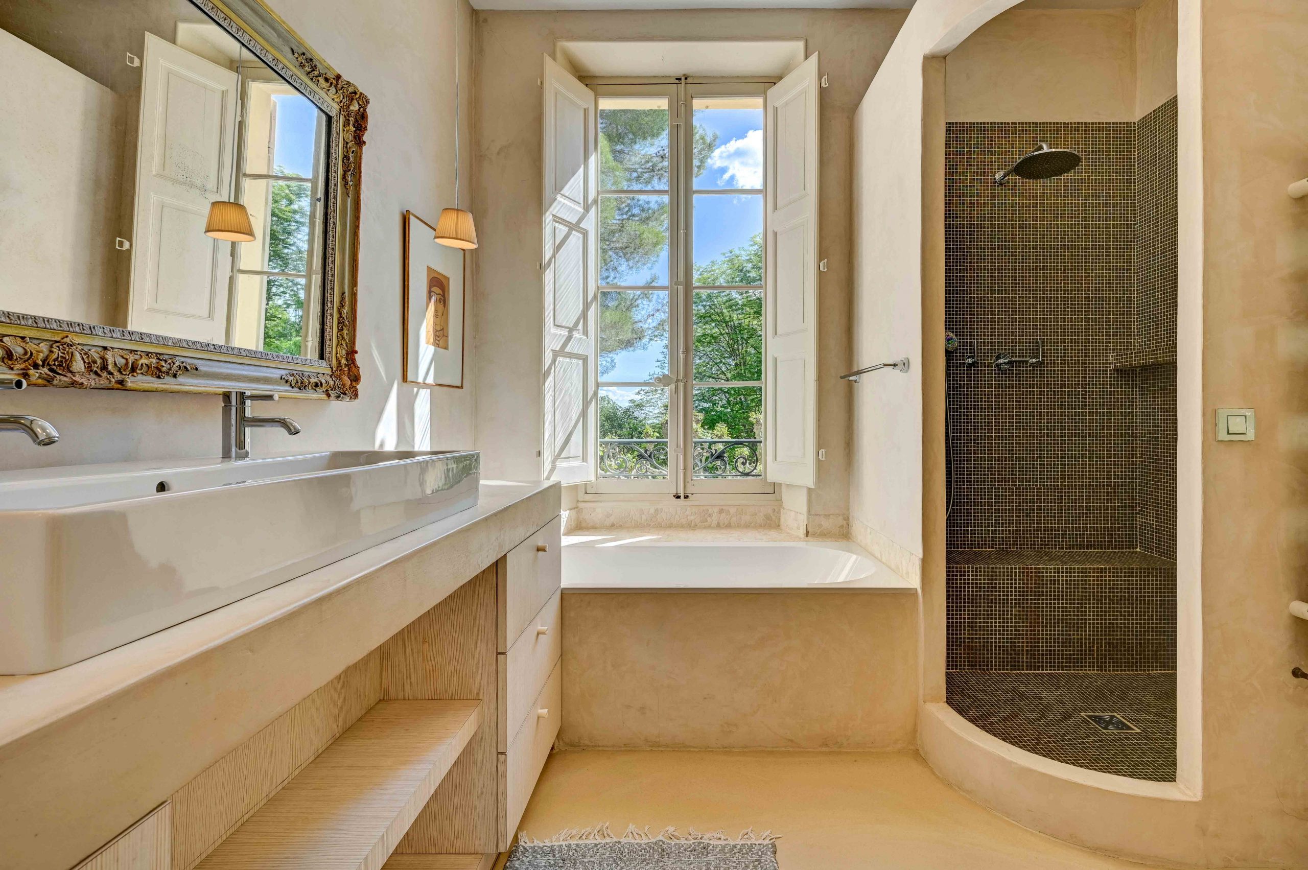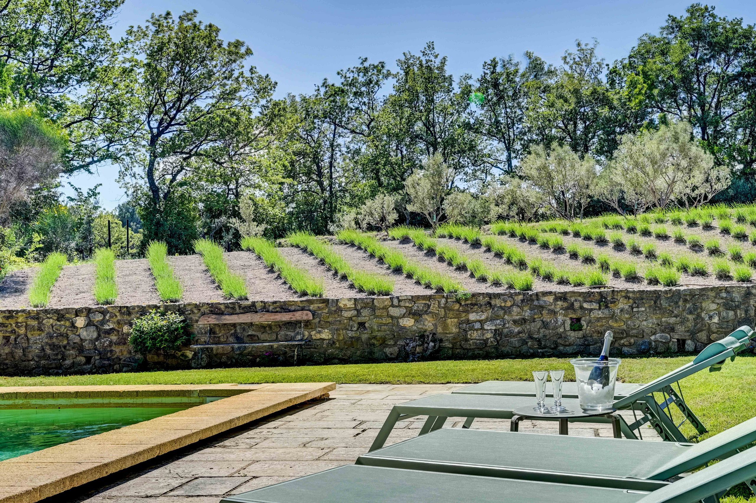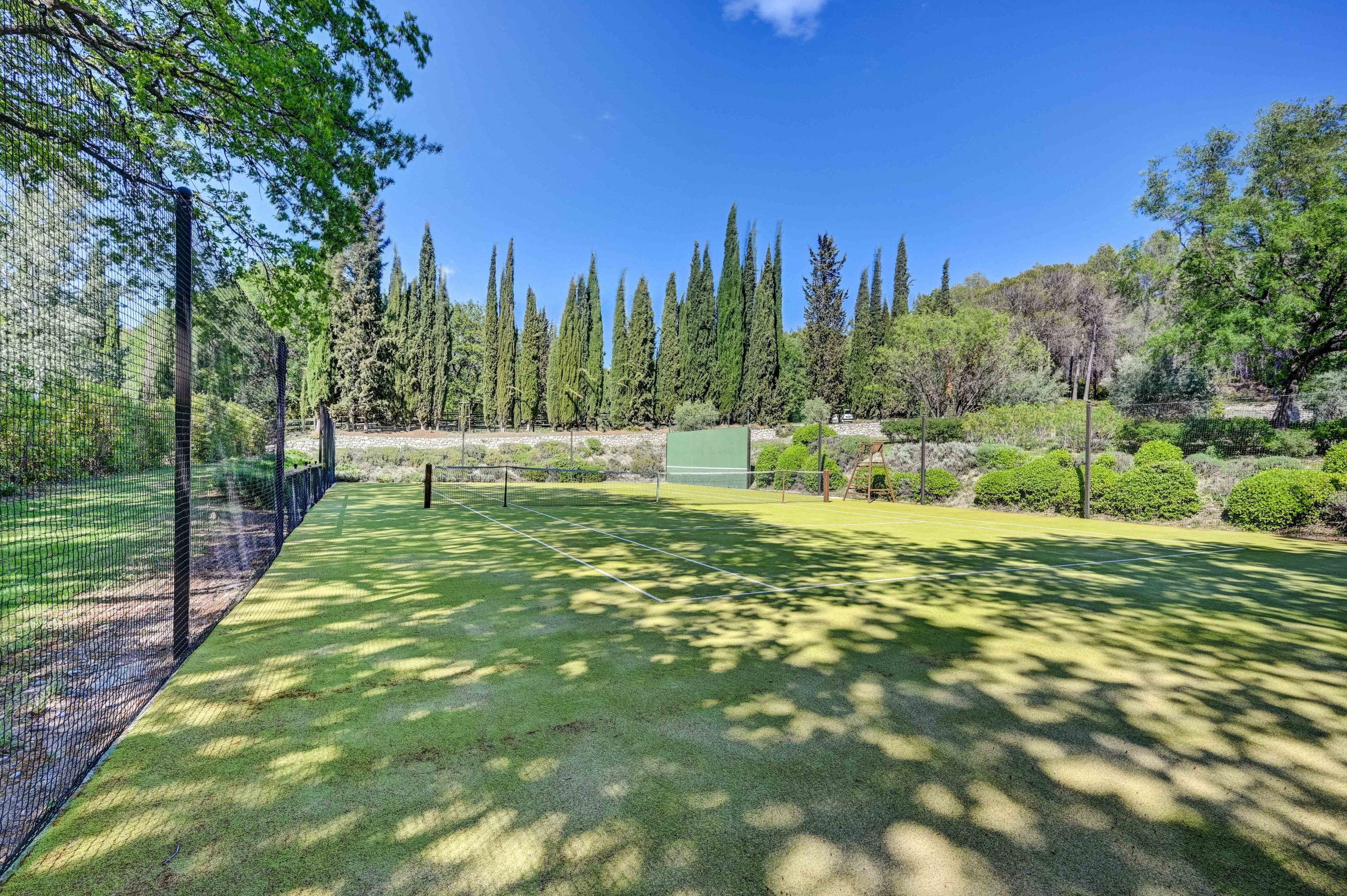 L’extérieur de la Bastide du Souvenir est un véritable havre de paix, où la nature règne en maître. Les essences méditerranéennes vous offrent un spectacle de couleurs et de senteurs, tandis que le doux bruit de l’eau de la source naturelle vous apaisera. La piscine de quinze mètres par six, avec son pool house aménagé, est le lieu idéal pour se rafraîchir lors des chaudes journées d’été. Le terrain de tennis ombragé, quant à lui, ravira les sportifs en herbe.