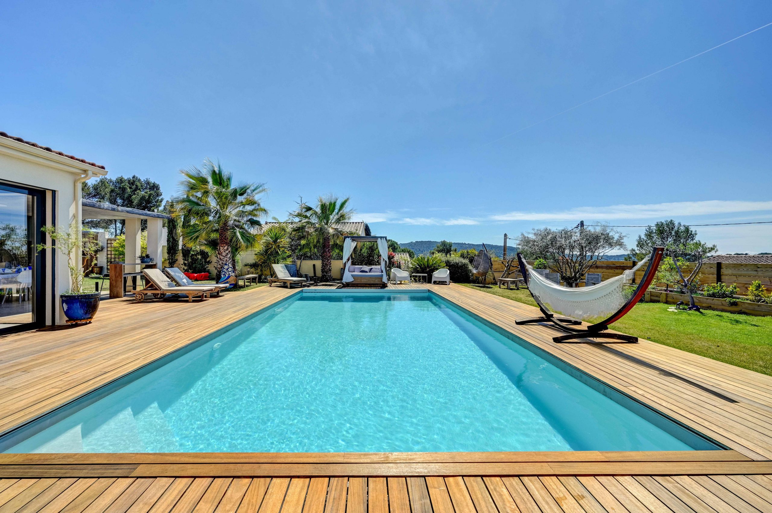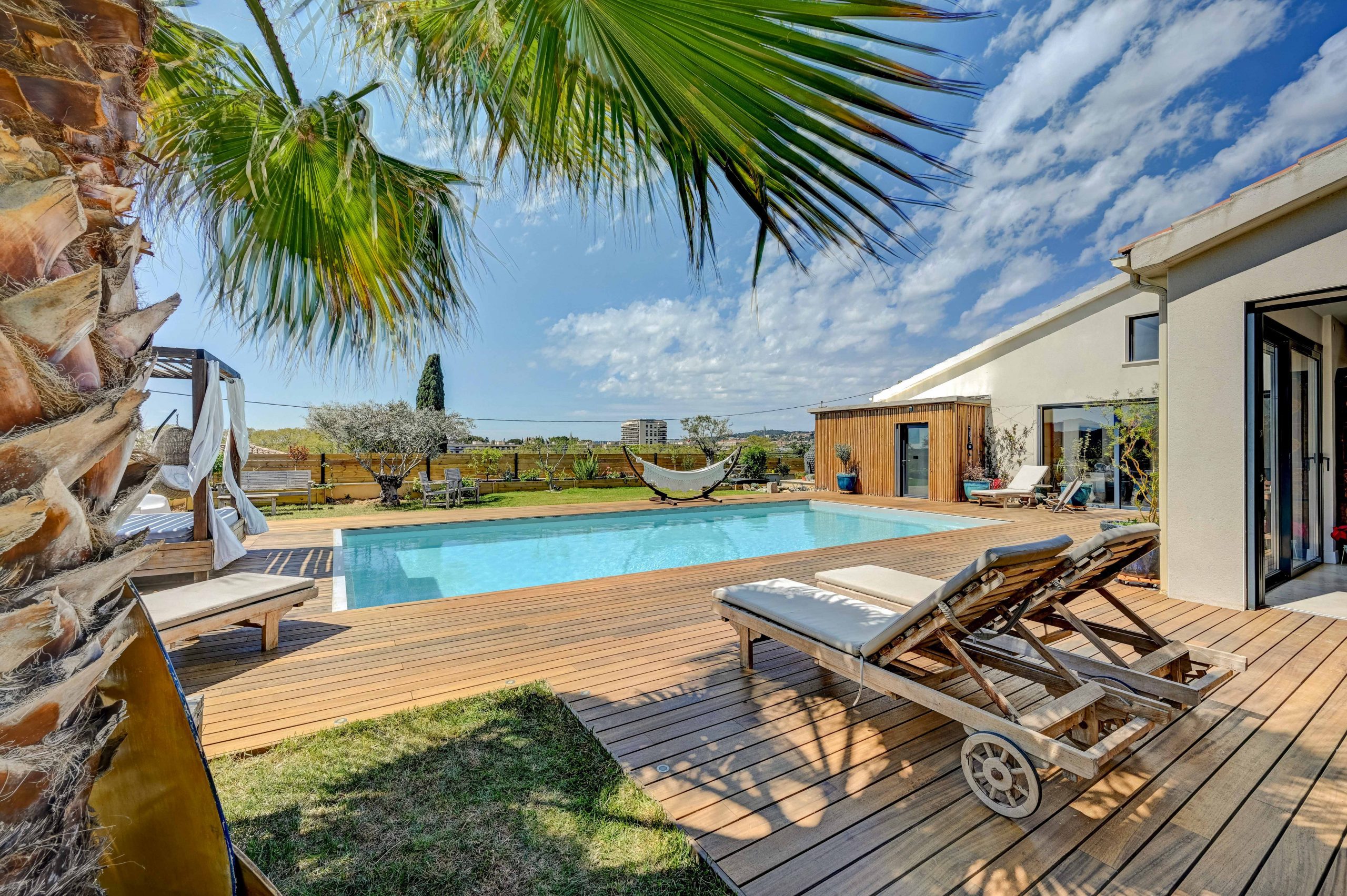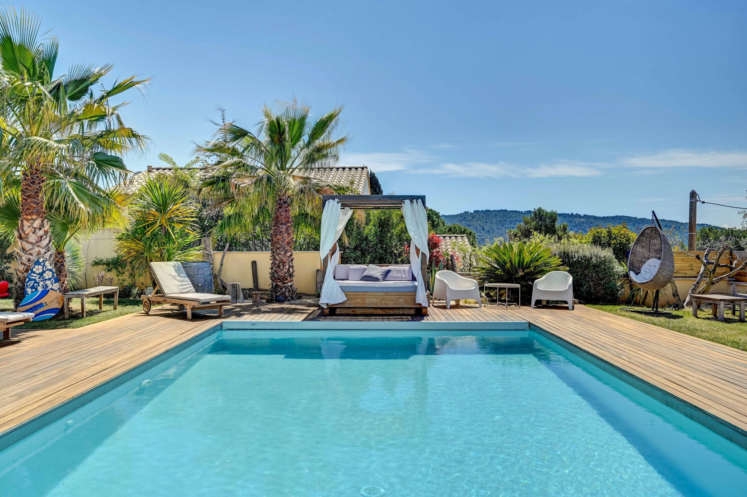 L’extérieur de la Villa Alma est un véritable paradis. Une grande piscine vous invite à vous rafraîchir et à vous détendre sous le soleil de Provence. La vaste terrasse offre une vue panoramique sur la ville d’Aix-en-Provence, créant un cadre idyllique pour vous détendre ou pour profiter de repas en plein air. Une cuisine extérieure couverte entièrement équipée vous permettra de préparer des repas en plein air avec facilité, tandis qu’un grand salon de jardin couvert vous offre un espace confortable pour vous détendre à l’ombre. Pour les moments de détente, vous pourrez vous prélasser sur les transats ou vous reposer dans le lit baldaquin, créant ainsi une atmosphère de luxe et de bien-être.