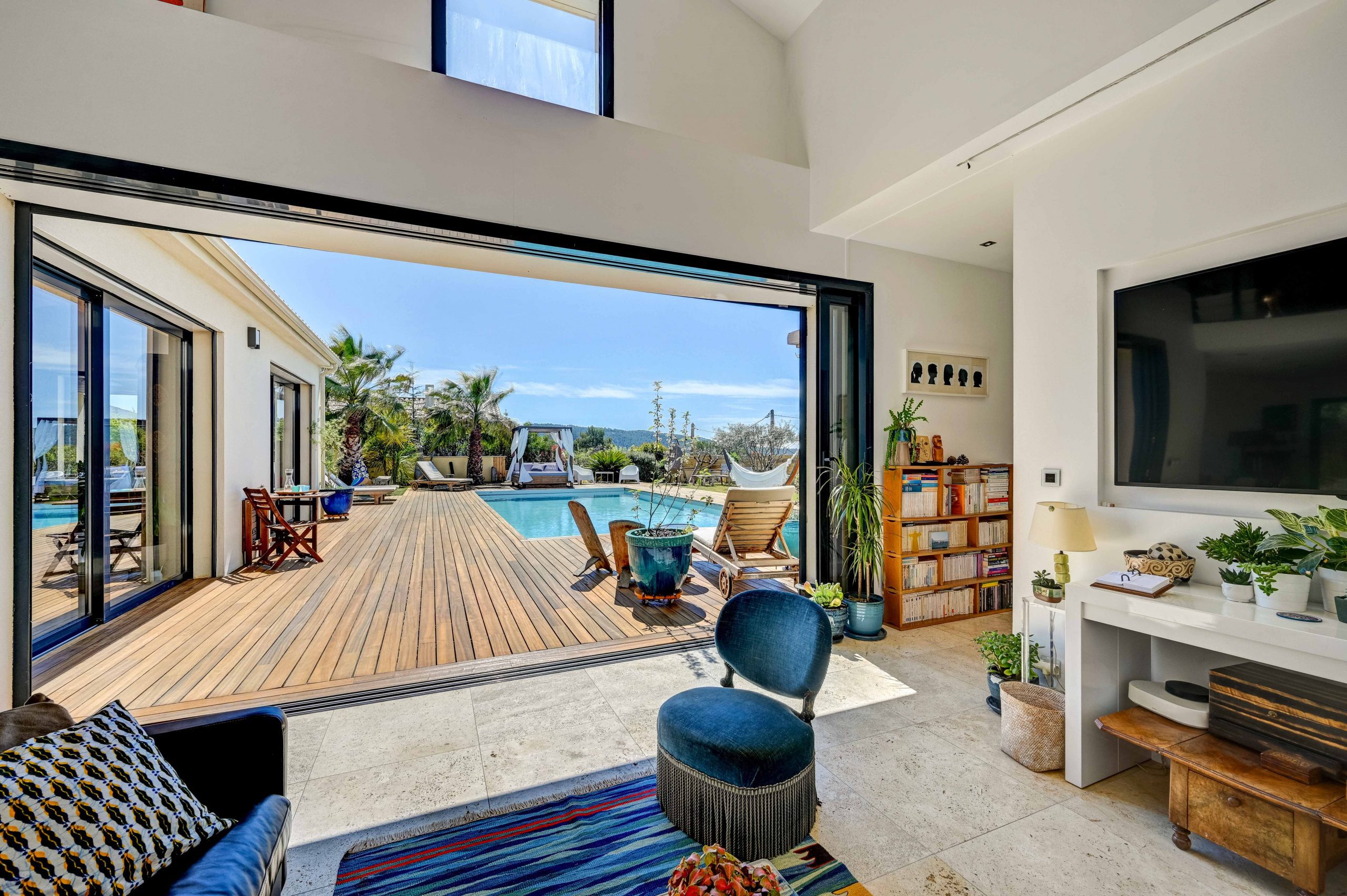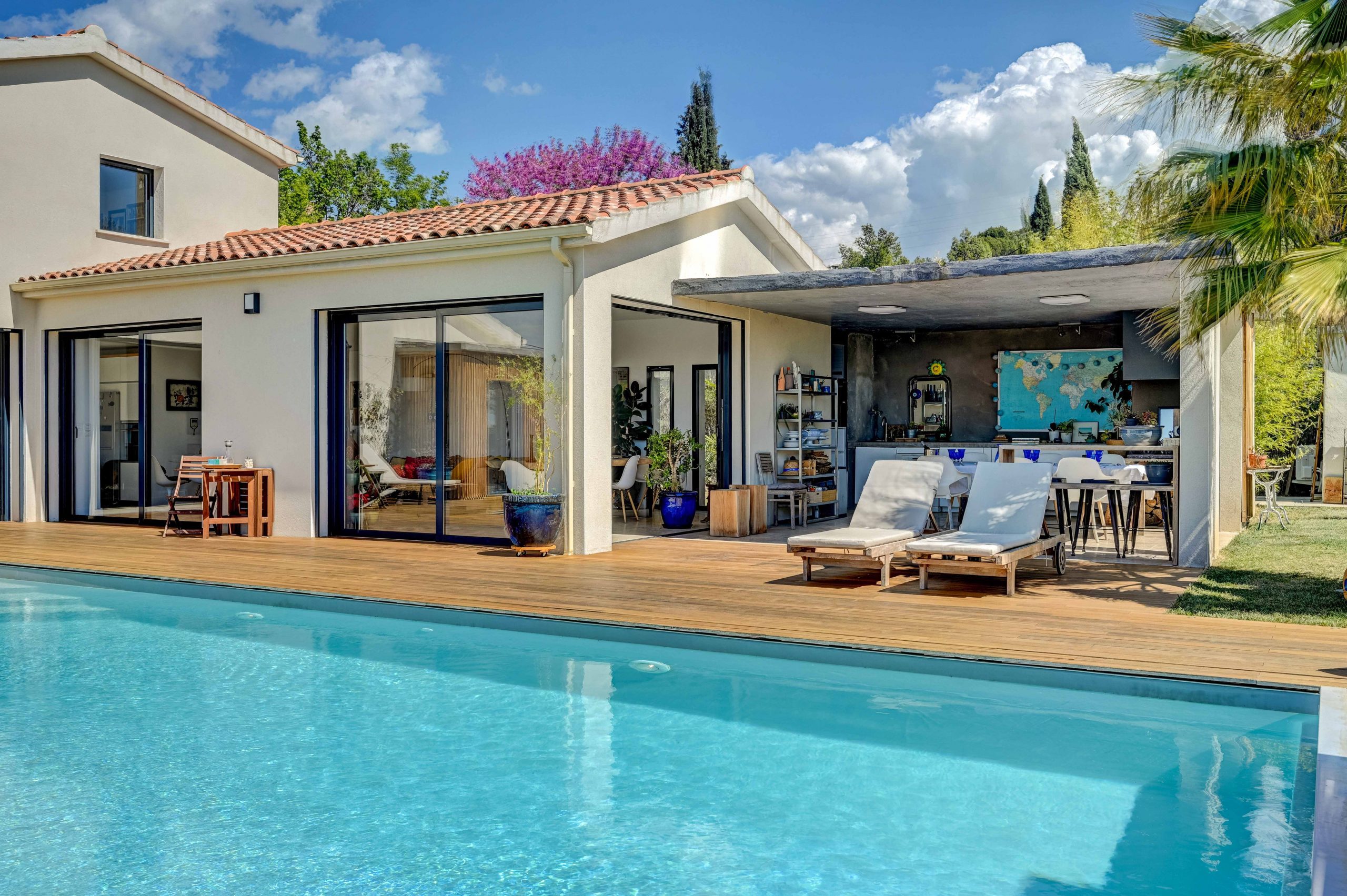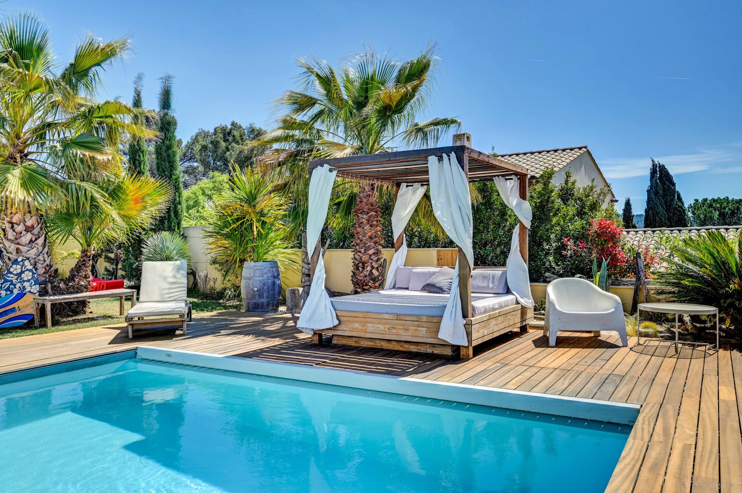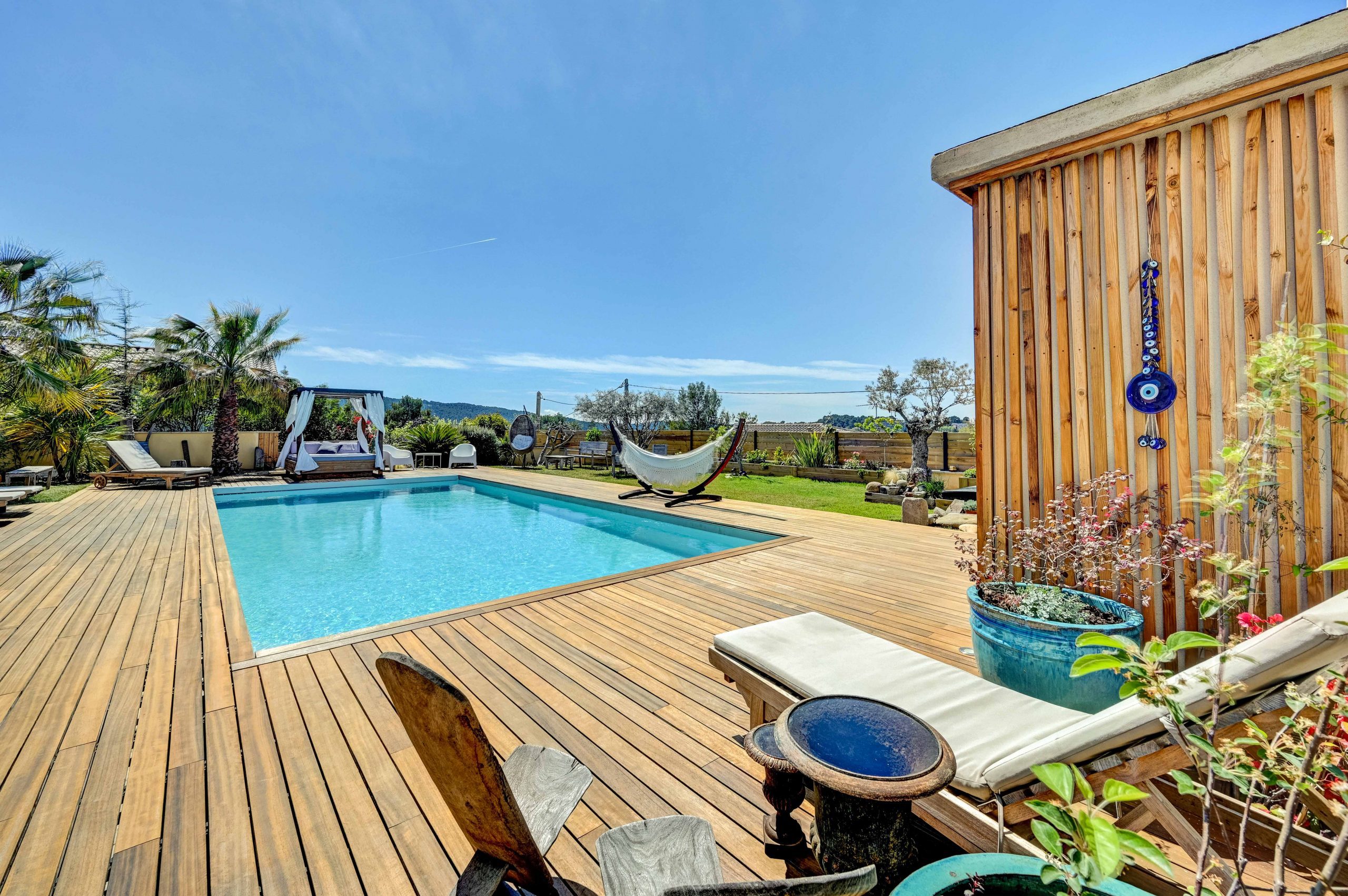 L’extérieur de la Villa Alma est un véritable paradis. Une grande piscine vous invite à vous rafraîchir et à vous détendre sous le soleil de Provence. La vaste terrasse offre une vue panoramique sur la ville d’Aix-en-Provence, créant un cadre idyllique pour vous détendre ou pour profiter de repas en plein air. Une cuisine extérieure couverte entièrement équipée vous permettra de préparer des repas en plein air avec facilité, tandis qu’un grand salon de jardin couvert vous offre un espace confortable pour vous détendre à l’ombre. Pour les moments de détente, vous pourrez vous prélasser sur les transats ou vous reposer dans le lit baldaquin, créant ainsi une atmosphère de luxe et de bien-être.