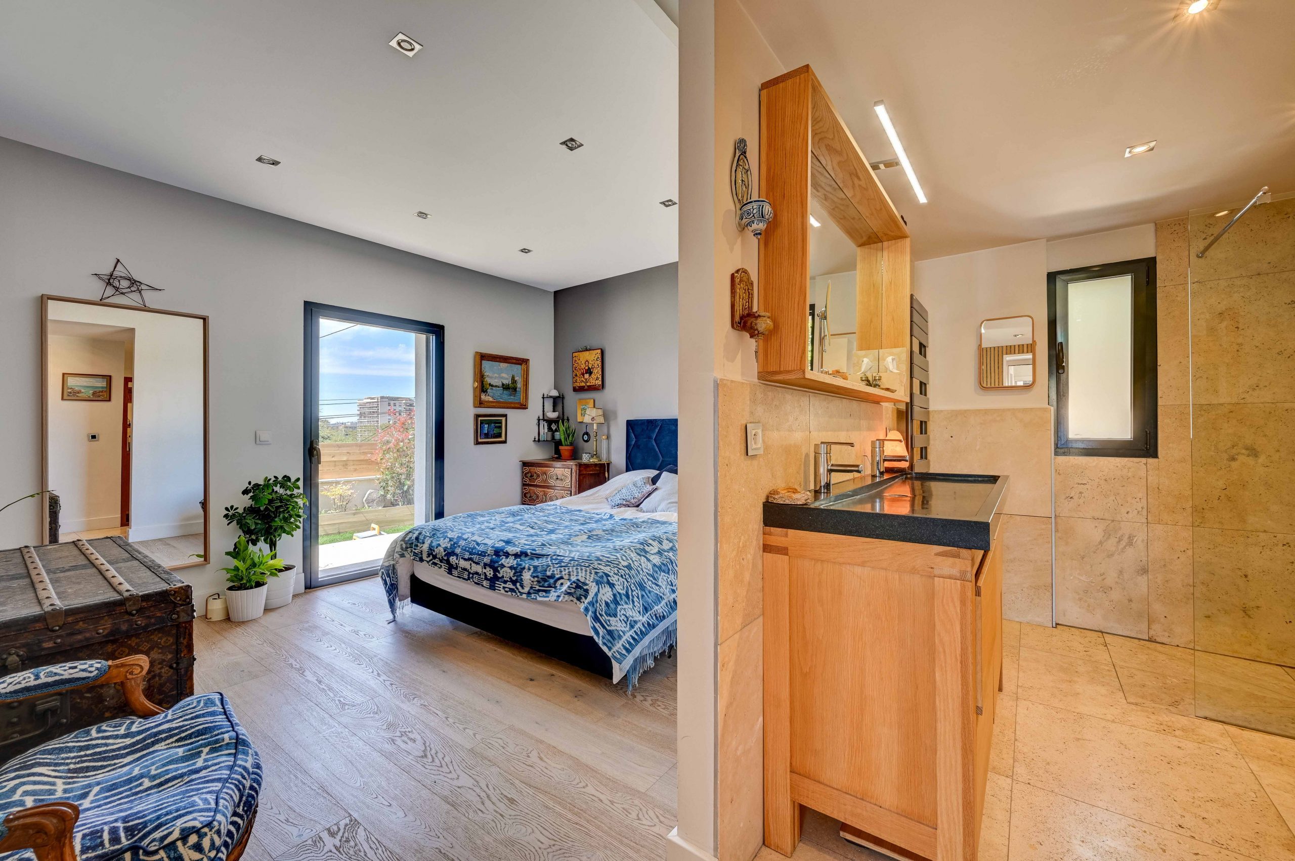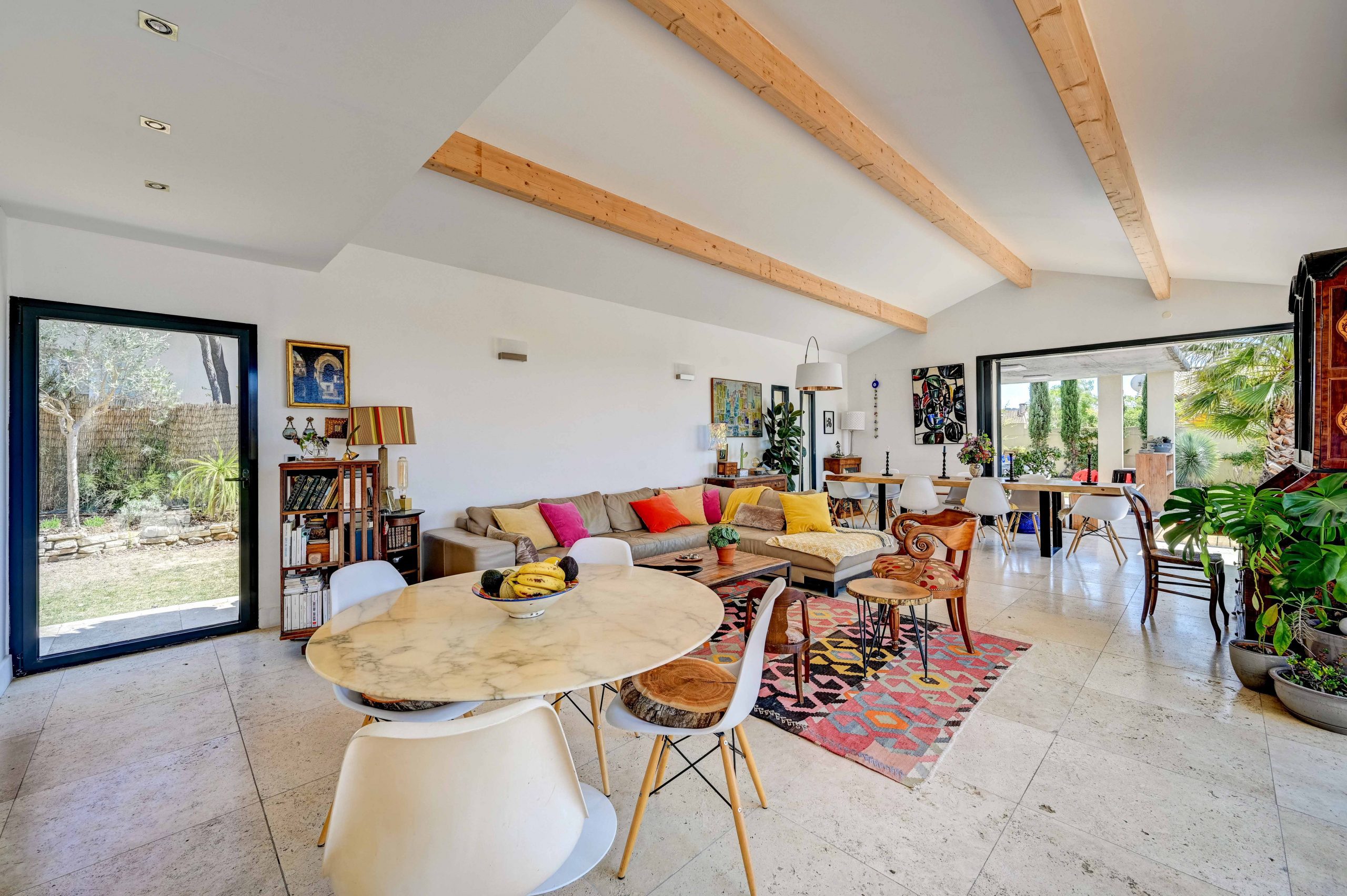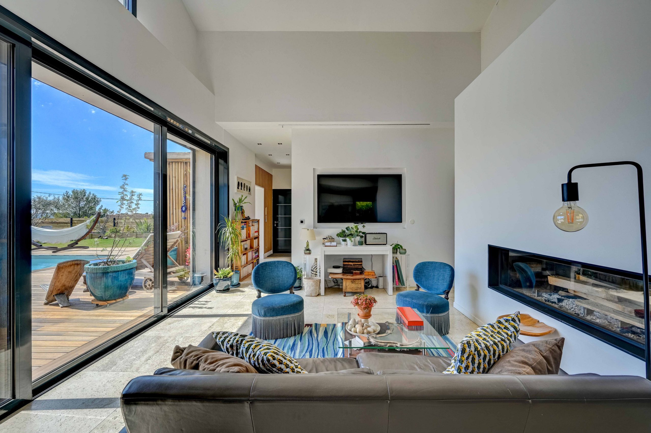 Dès votre arrivée à la Villa Alma, vous serez séduit par son architecture élégante et son aménagement intérieur raffiné. Au rez-de-chaussée, vous découvrirez un vaste espace de vie composé d’un salon spacieux et d’une salle à manger lumineuse, ouverte sur l’extérieur par de larges baies à galandage, qui laissent entrer la lumière naturelle et offrent une vue sur le jardin. Ce salon est un lieu parfait pour se détendre en famille ou entre amis, avec ses confortables canapés et son ambiance chaleureuse.