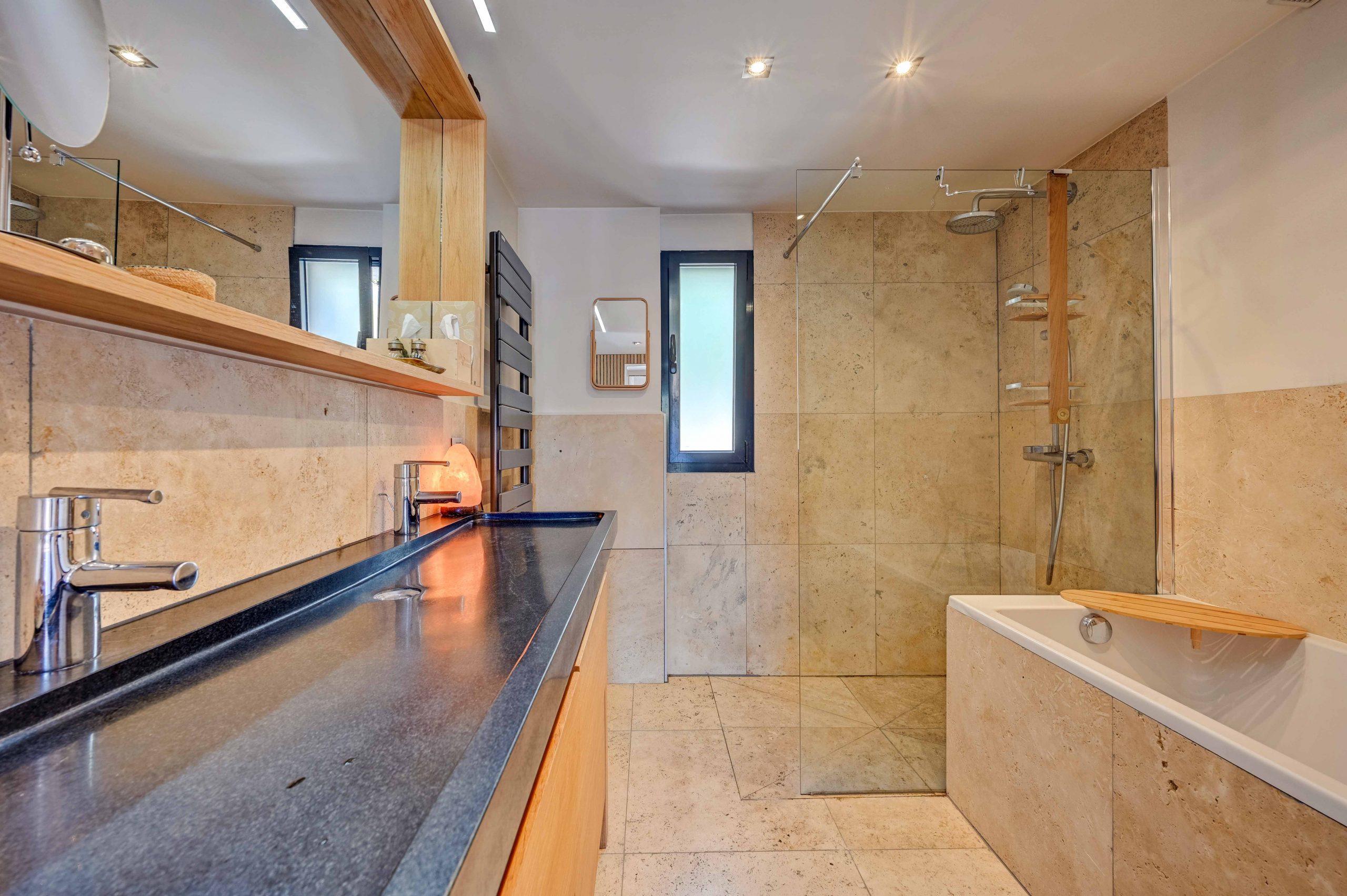 Au rez-de-chaussée, vous trouverez une suite double avec sa propre salle de bain privative, équipée d’une douche et d’une baignoire, pour vous offrir tout le confort nécessaire. Une autre chambre double, avec un canapé-lit convertible, dispose également de sa propre salle d’eau privative.