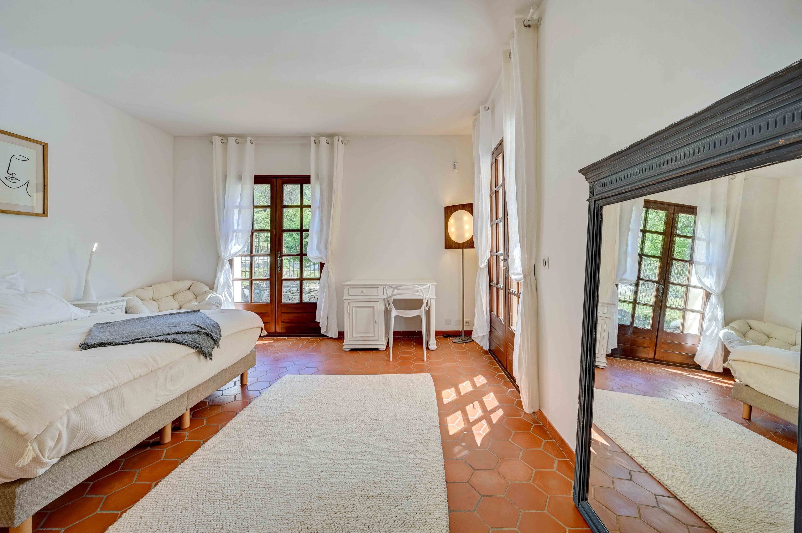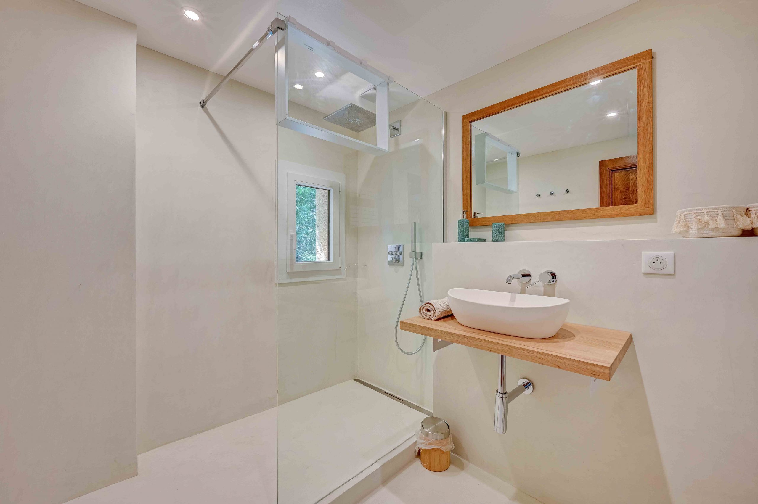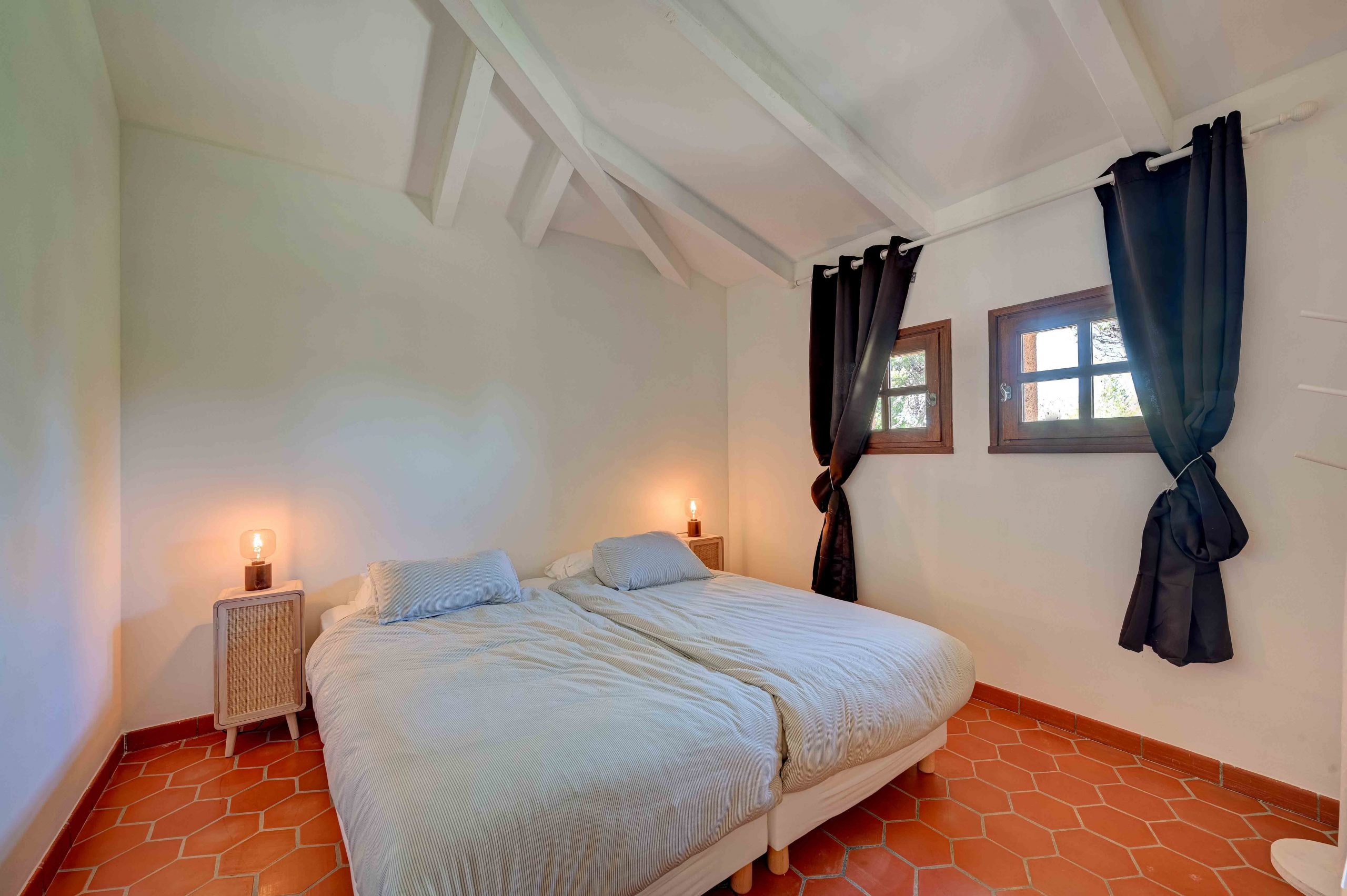 La villa dispose de 5 chambres climatisées offrant une capacité d’accueil de 10 personnes. La chambre 1 est une suite parentale située au rez-de-chaussée avec un lit 180×200, une salle de bain/douche et un WC. La chambre 2 est également une suite parentale avec la possibilité d’un lit 180×200 ou de 2 lits de 90×200, avec salle de douche et WC. Les chambres 3 et 4 ont également la possibilité d’un lit 180×200 ou de 2 lits de 90×200 et partagent une salle de douche et un WC séparé. La chambre 5 est une autre suite parentale avec un lit 160×200, une salle de douche et un WC.