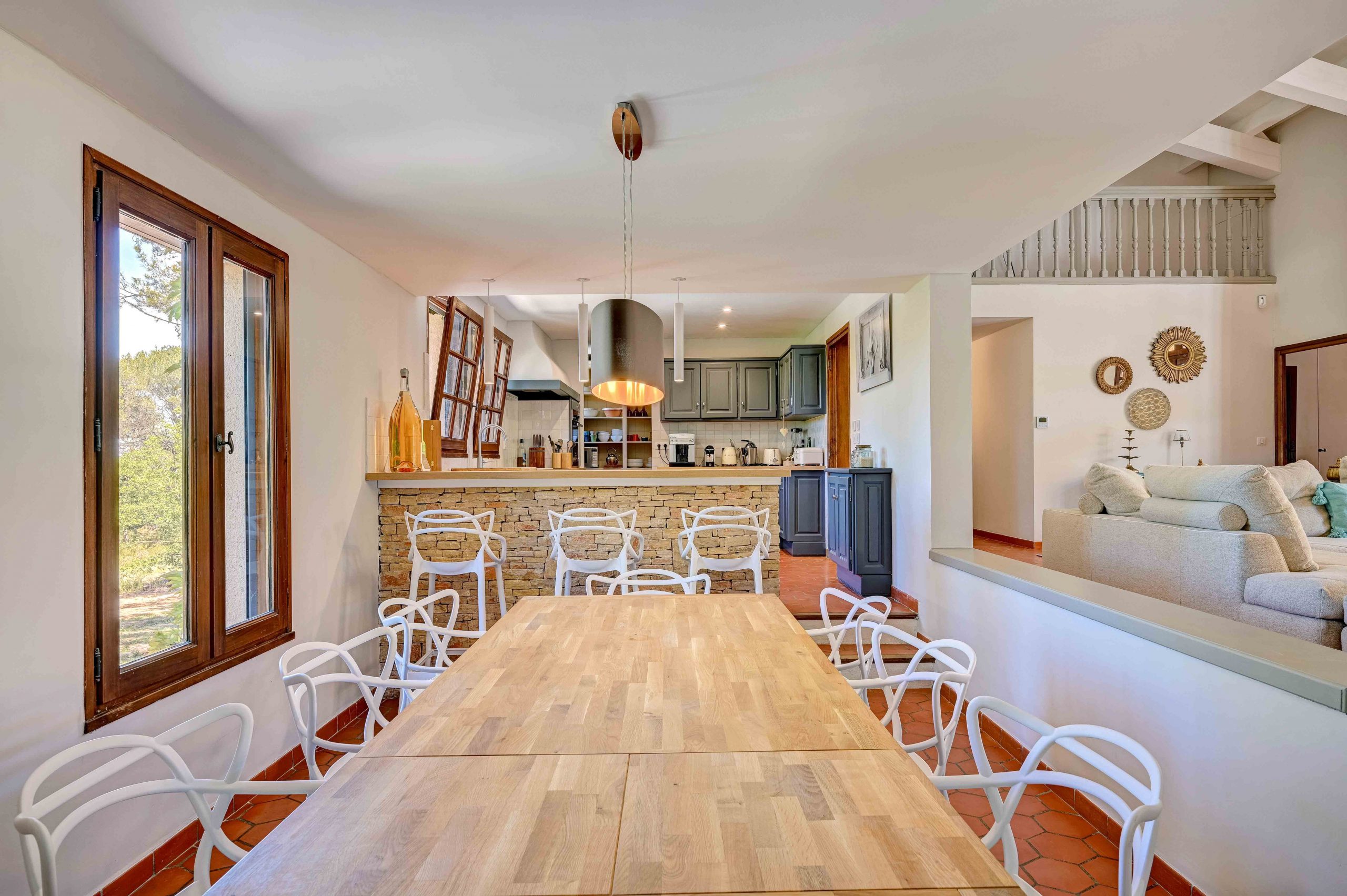La villa dispose d’un vaste hall d’entrée avec un vestiaire, un très grand séjour cathédrale, une cuisine hyper équipée et une salle à manger avec cheminée. Un coin lecture et jeux a également été aménagé avec un babyfoot René Pierre, pour des moments de détente en famille ou entre amis. Vous pourrez également profiter d’une cuisine d’été équipée d’un coin repas/bar avec une plancha, un frigidaire et bien plus encore.