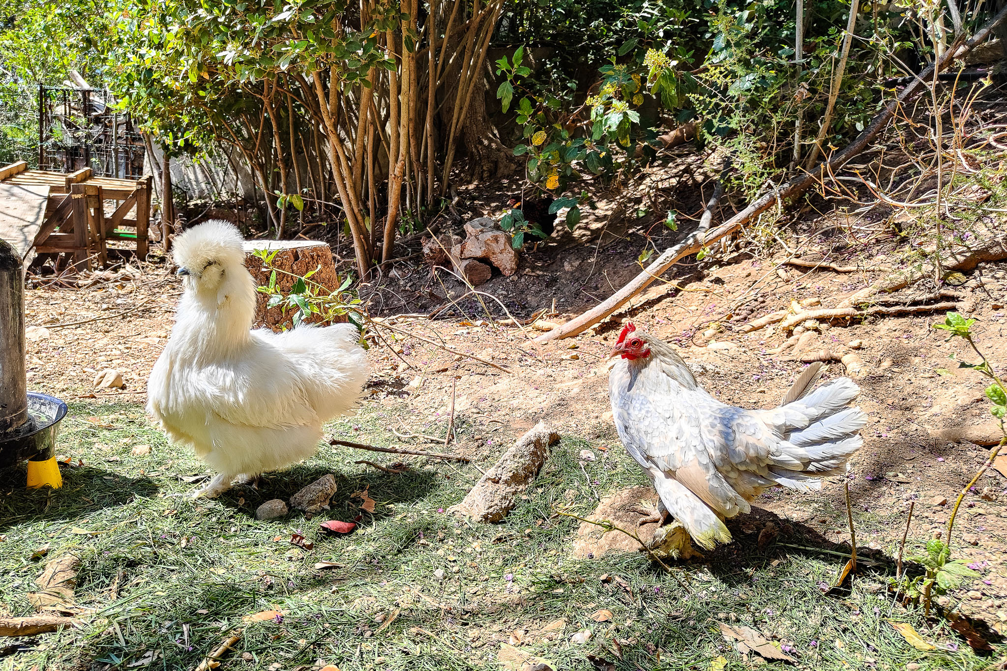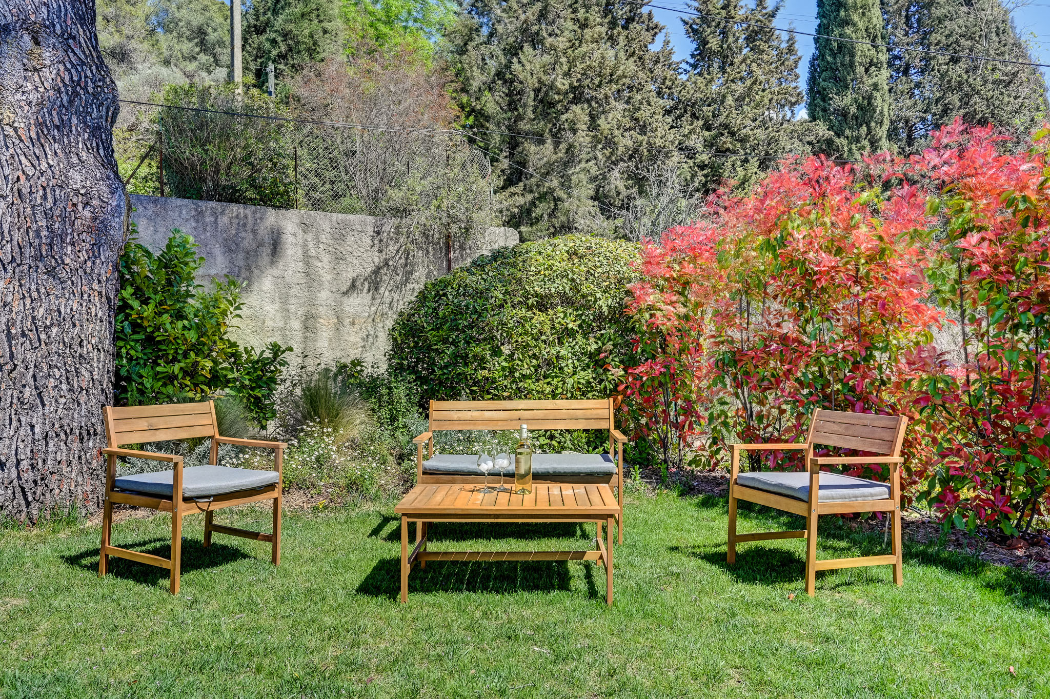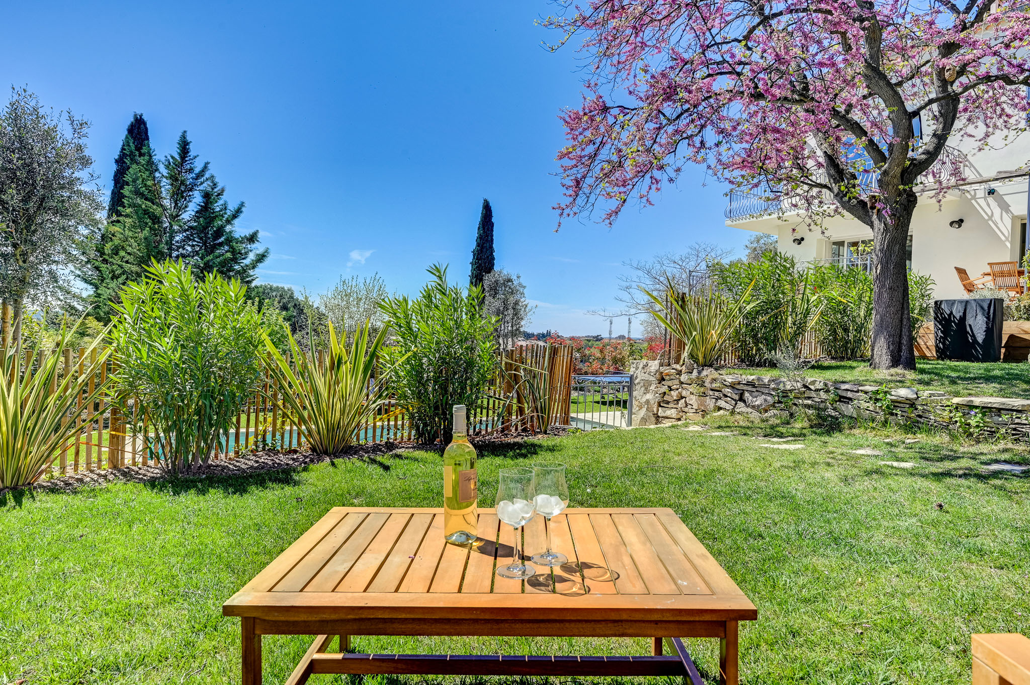Le jardin en restanques offre plusieurs espaces pour se détendre, prendre des repas et profiter des équipements de loisirs tels que la piscine, les transats, la table de ping-pong, le trampoline géant, le poulailler et le potager.