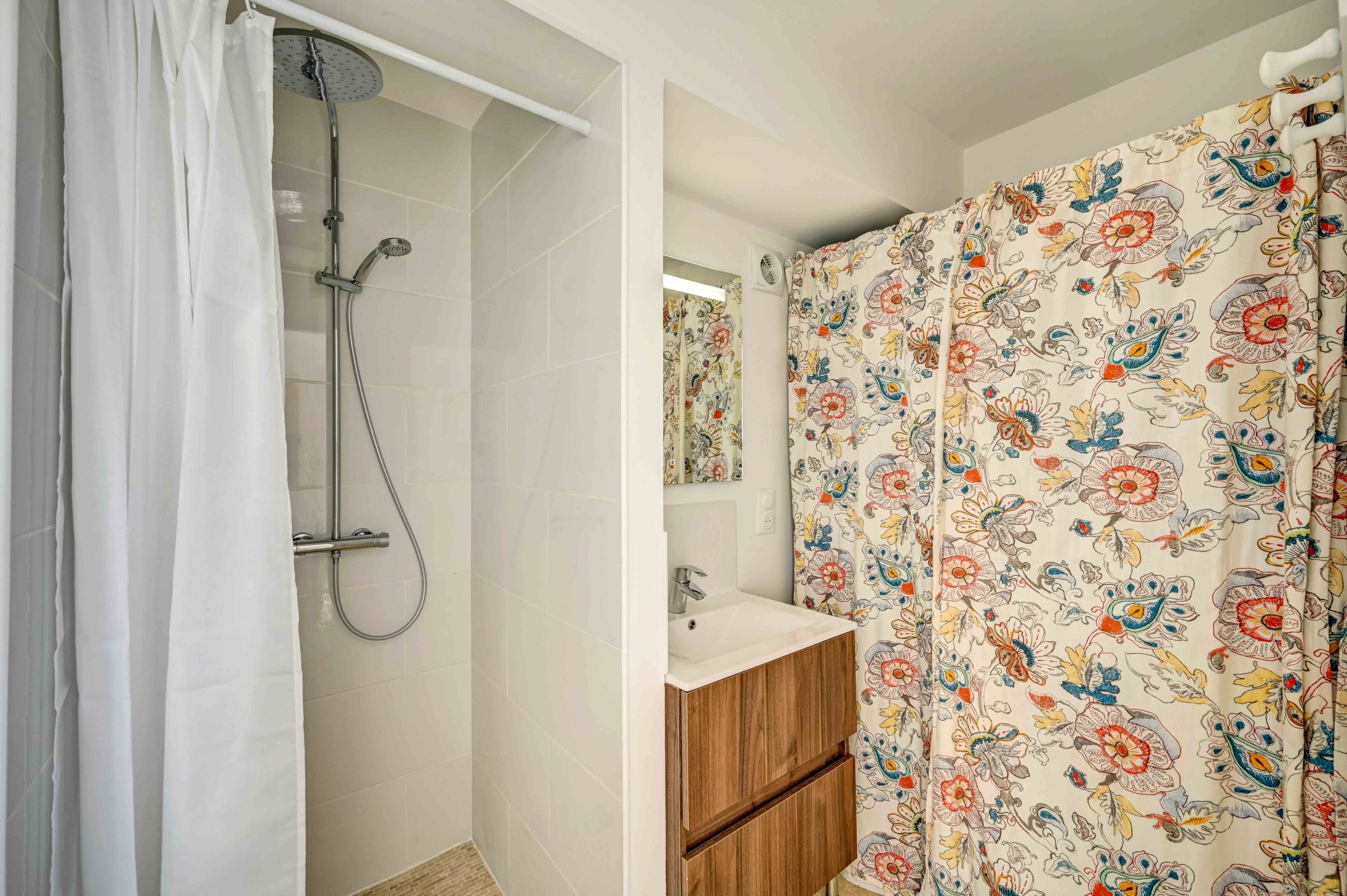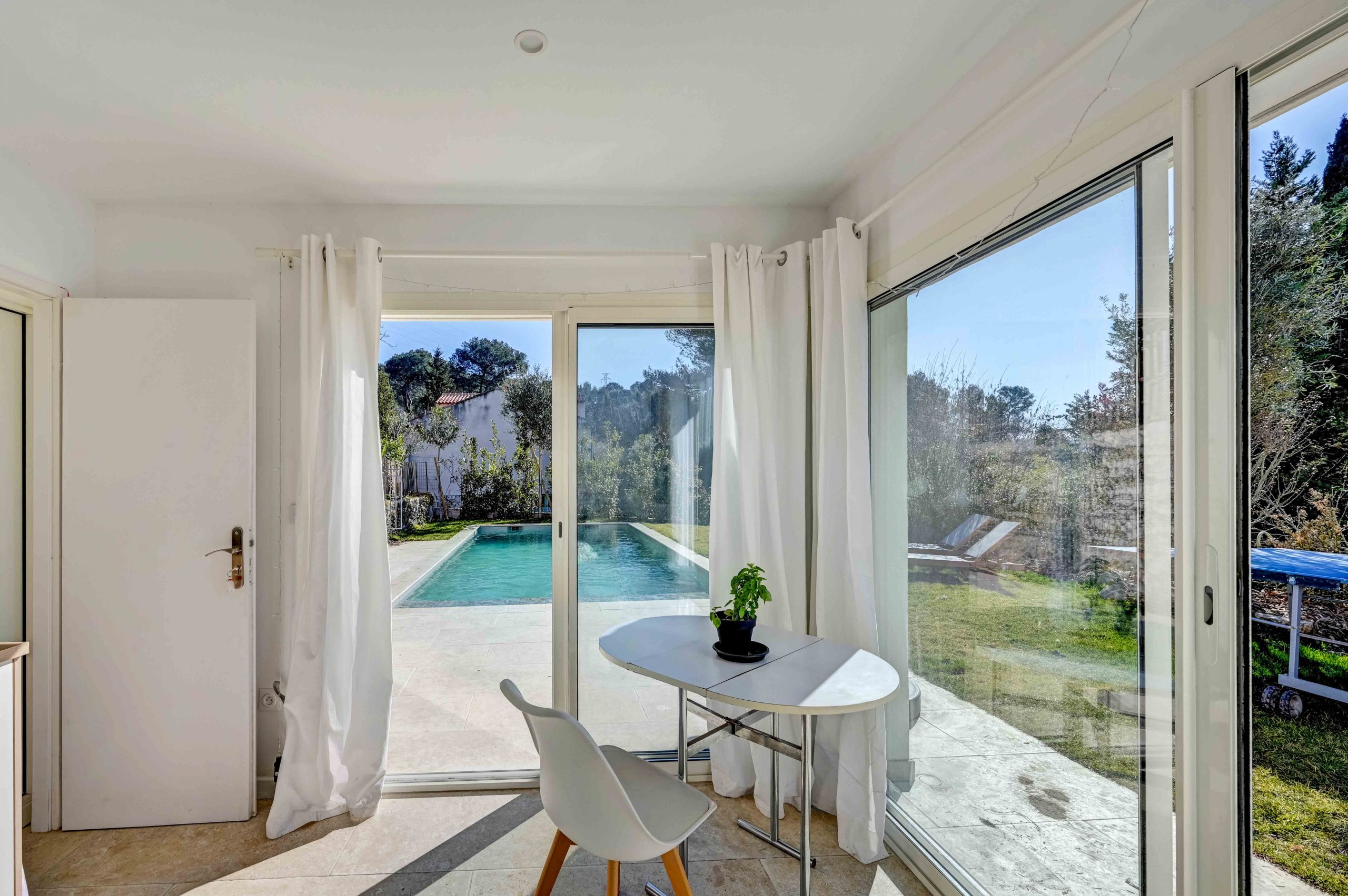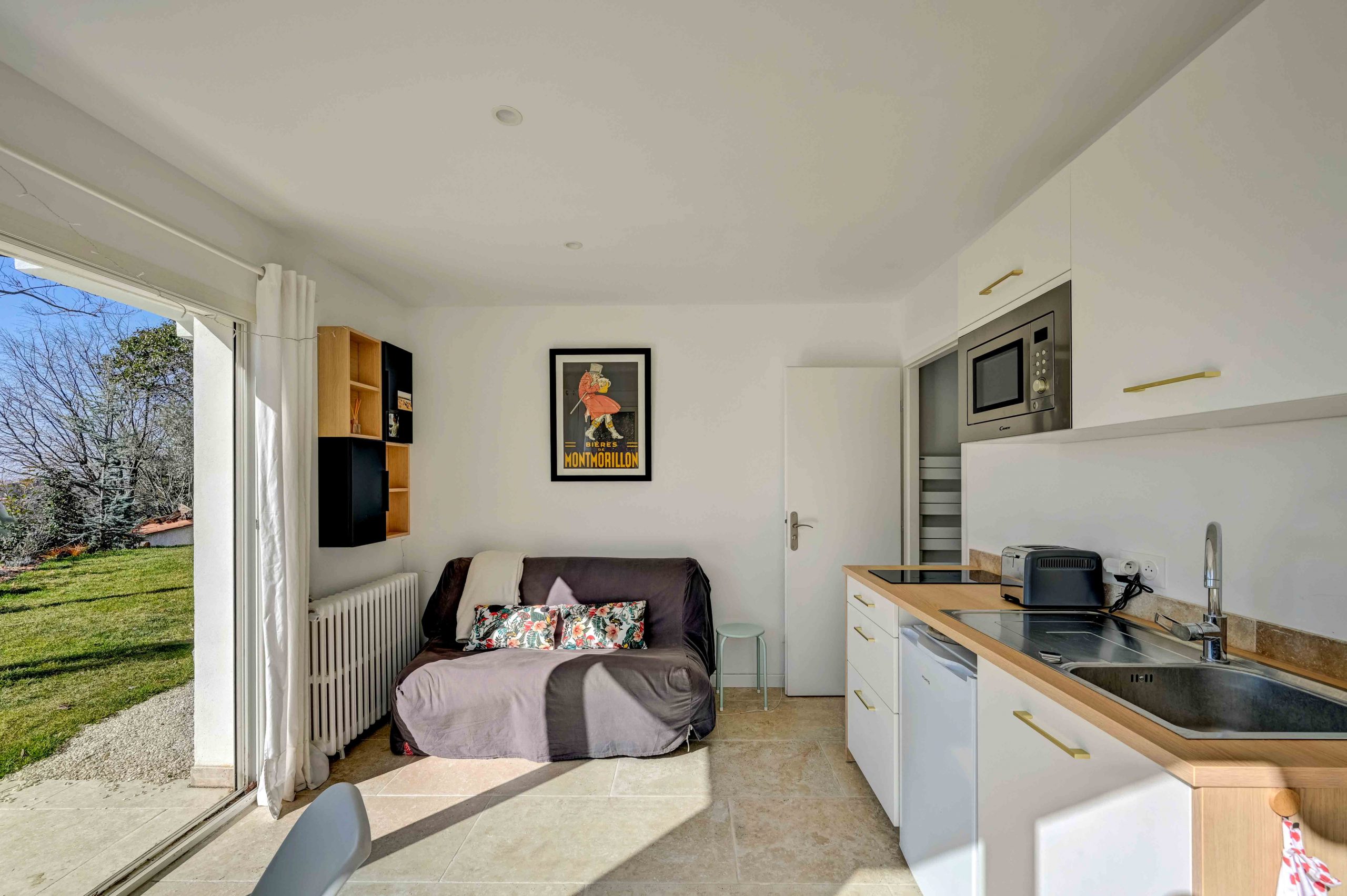 Le pool house, situé en rez-de-jardin avec de grandes baies vitrées ouvrant sur les extérieurs, la terrasse et la piscine, est une véritable dépendance équipée d’une cuisine ouverte, d’un canapé-lit et d’une salle d’eau privative.