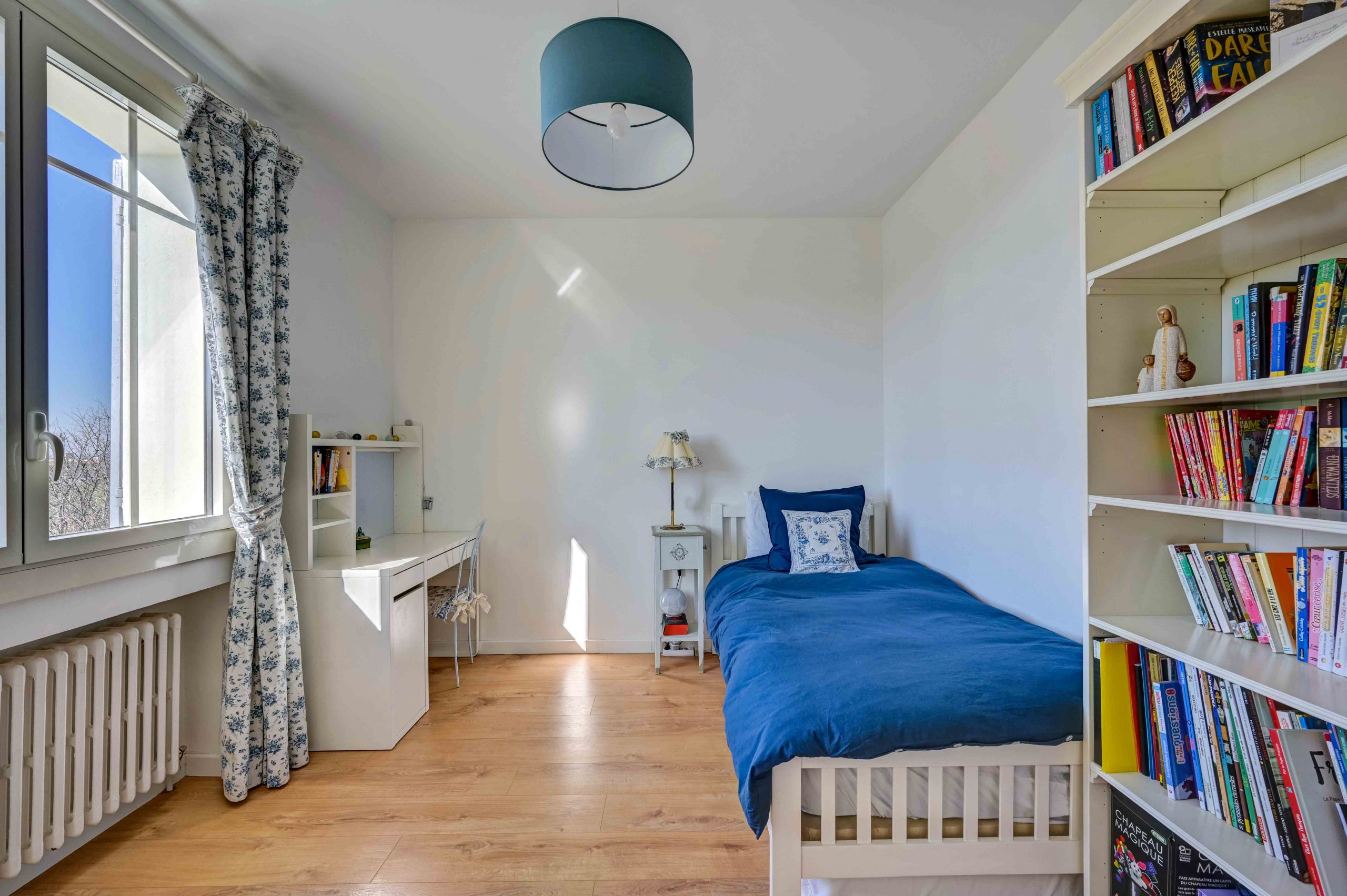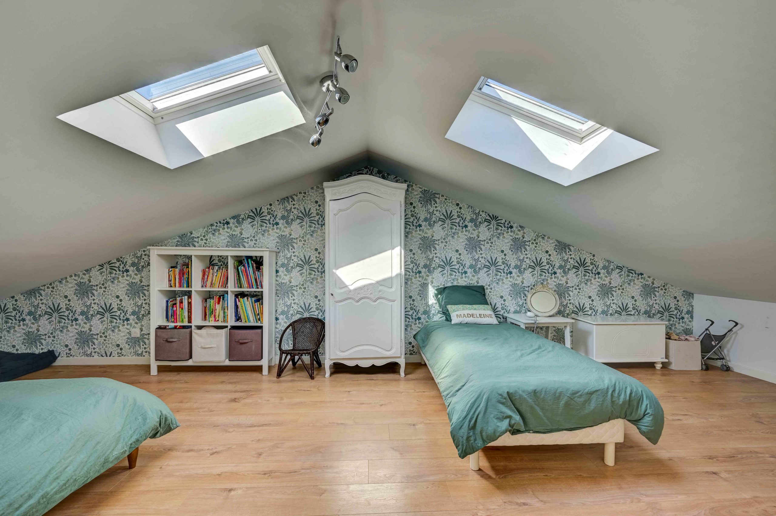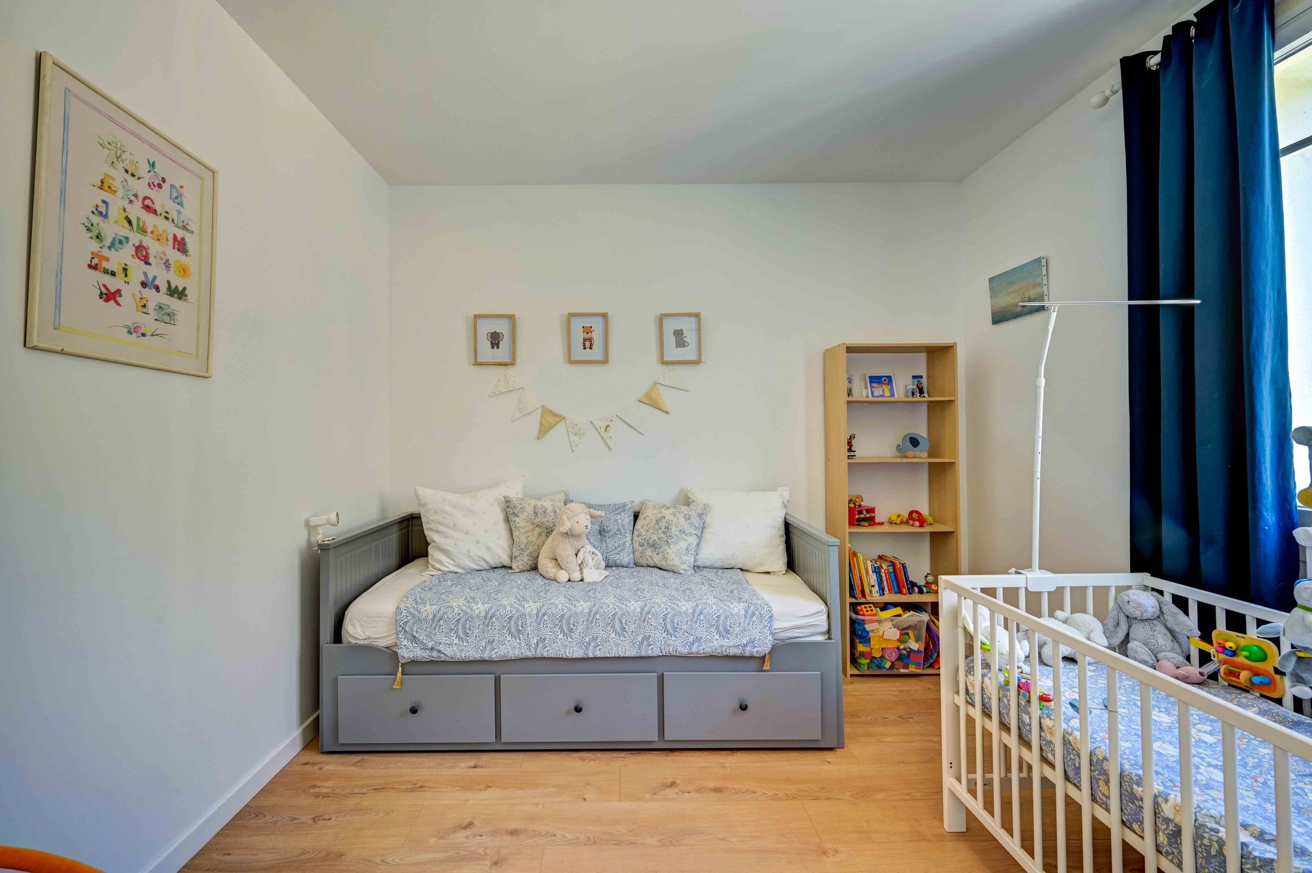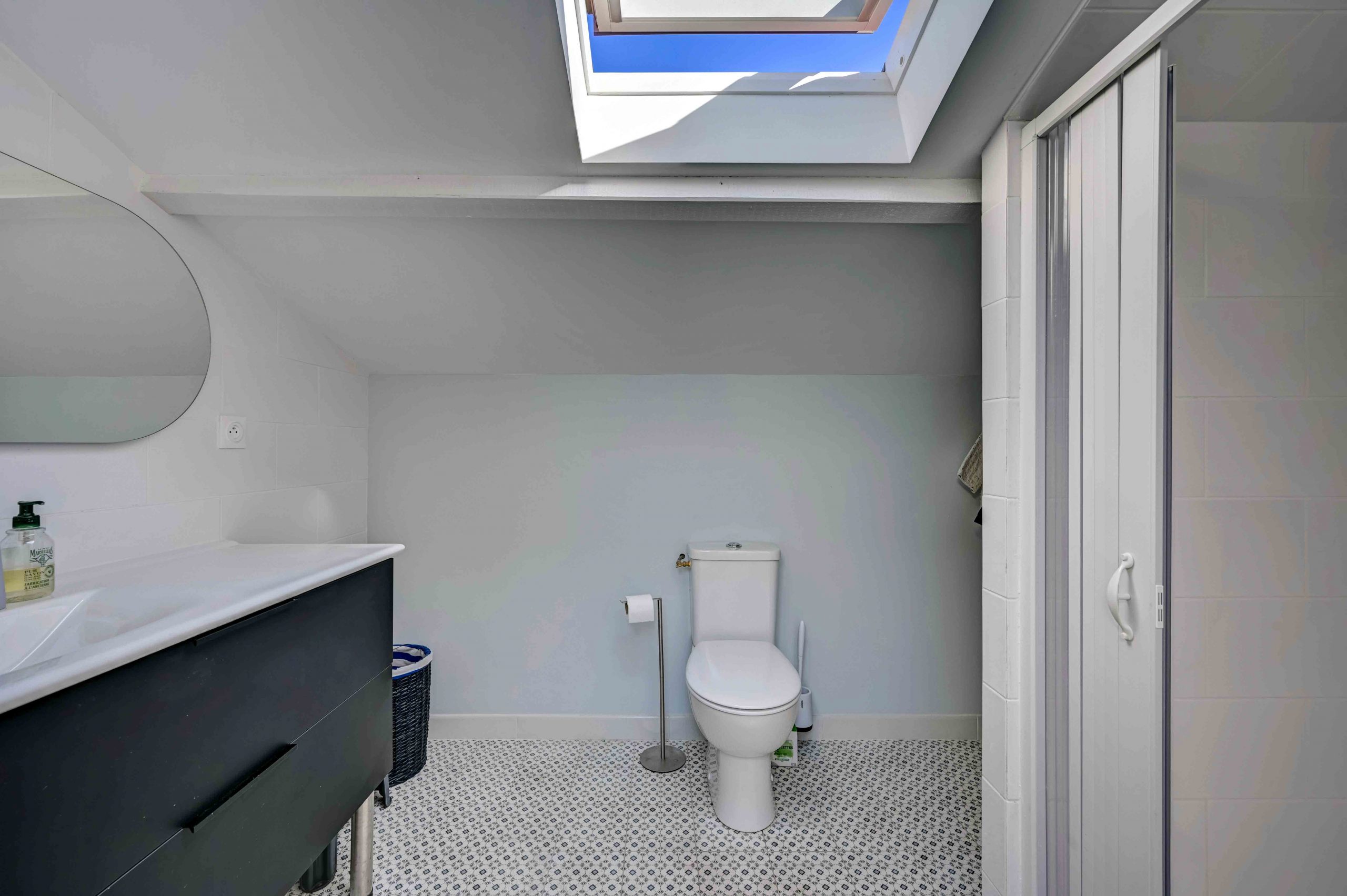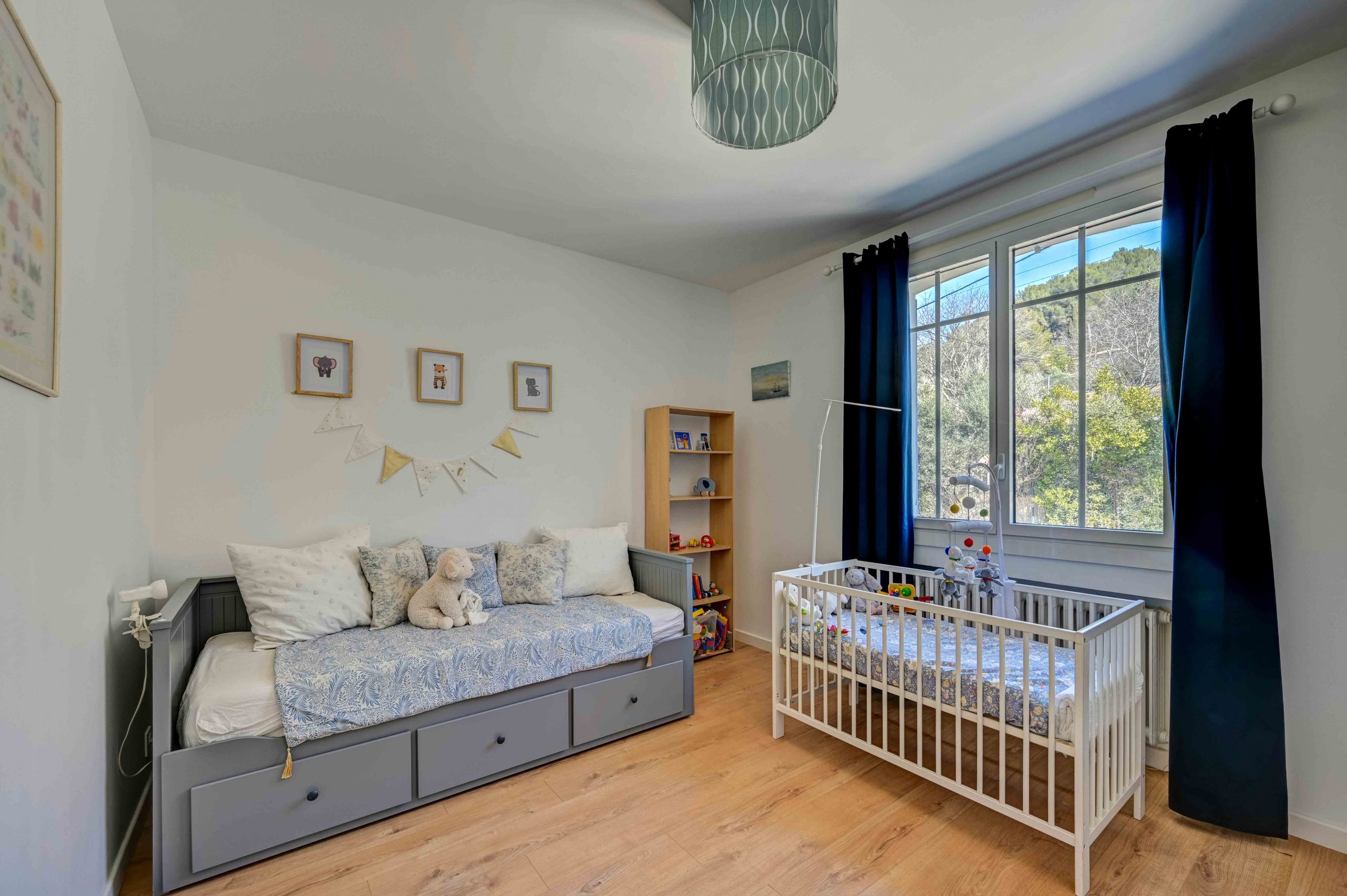 À l’étage, vous trouverez deux chambres simples pour enfants et une chambre double qui partagent une salle de bain avec toilettes séparées. Vous pourrez également profiter d’une suite parentale baignée de lumière, avec sa propre salle d’eau privative et un balcon donnant sur le jardin et la colline environnante.