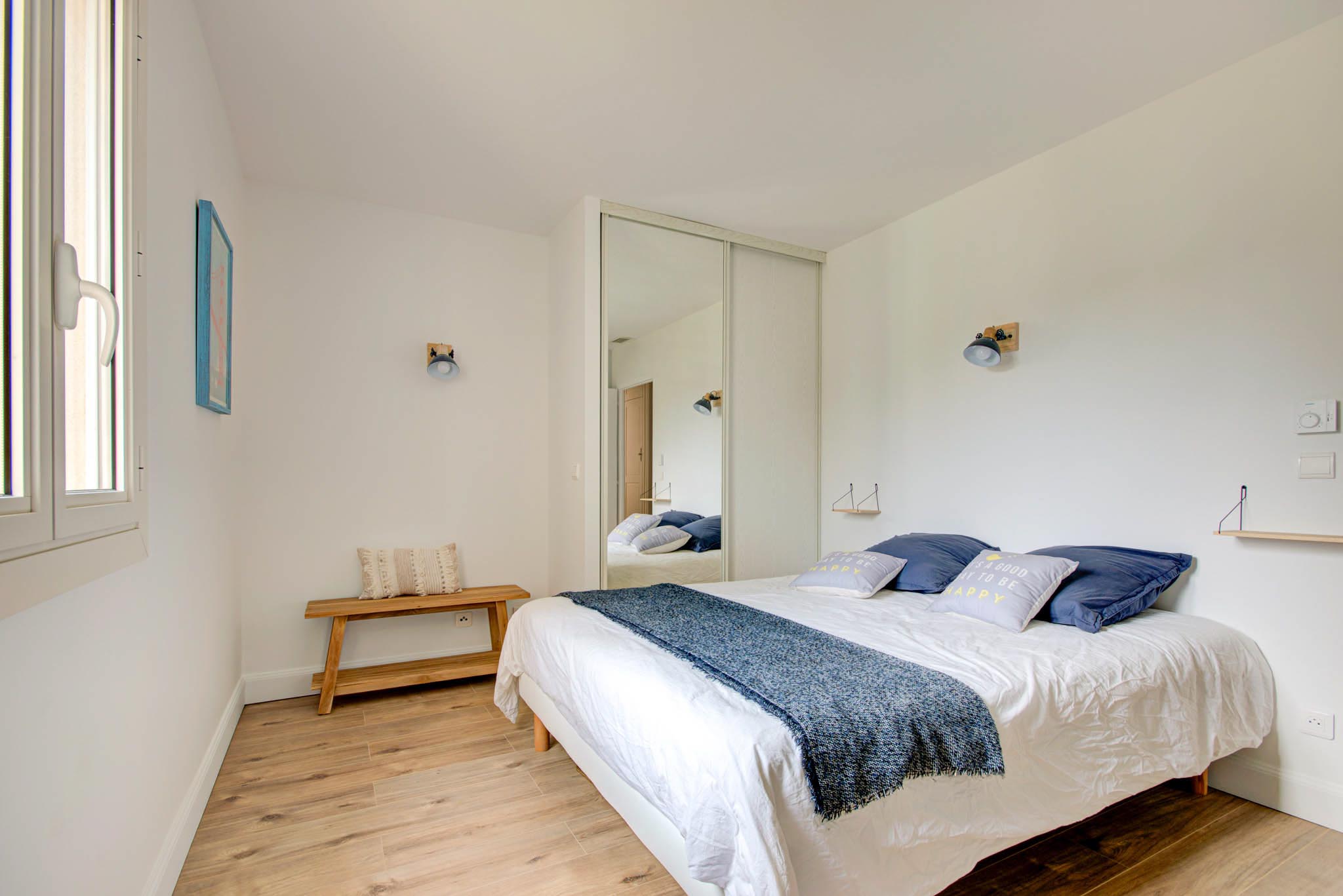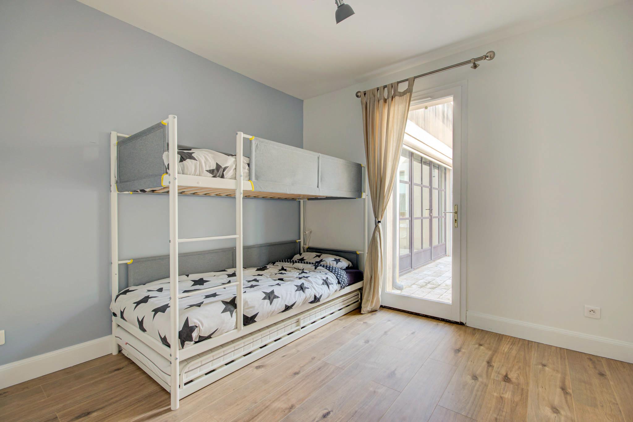 Au même niveau, le patio aménagé et les deux suites, dont une somptueuse chambre de maître avec un lit king size (200×200), ainsi que deux autres chambres, dont une chambre d’enfant avec des lits superposés, complètent l’ensemble pour un confort optimal.