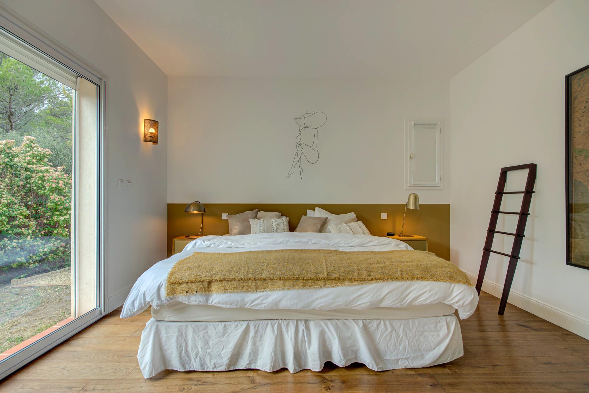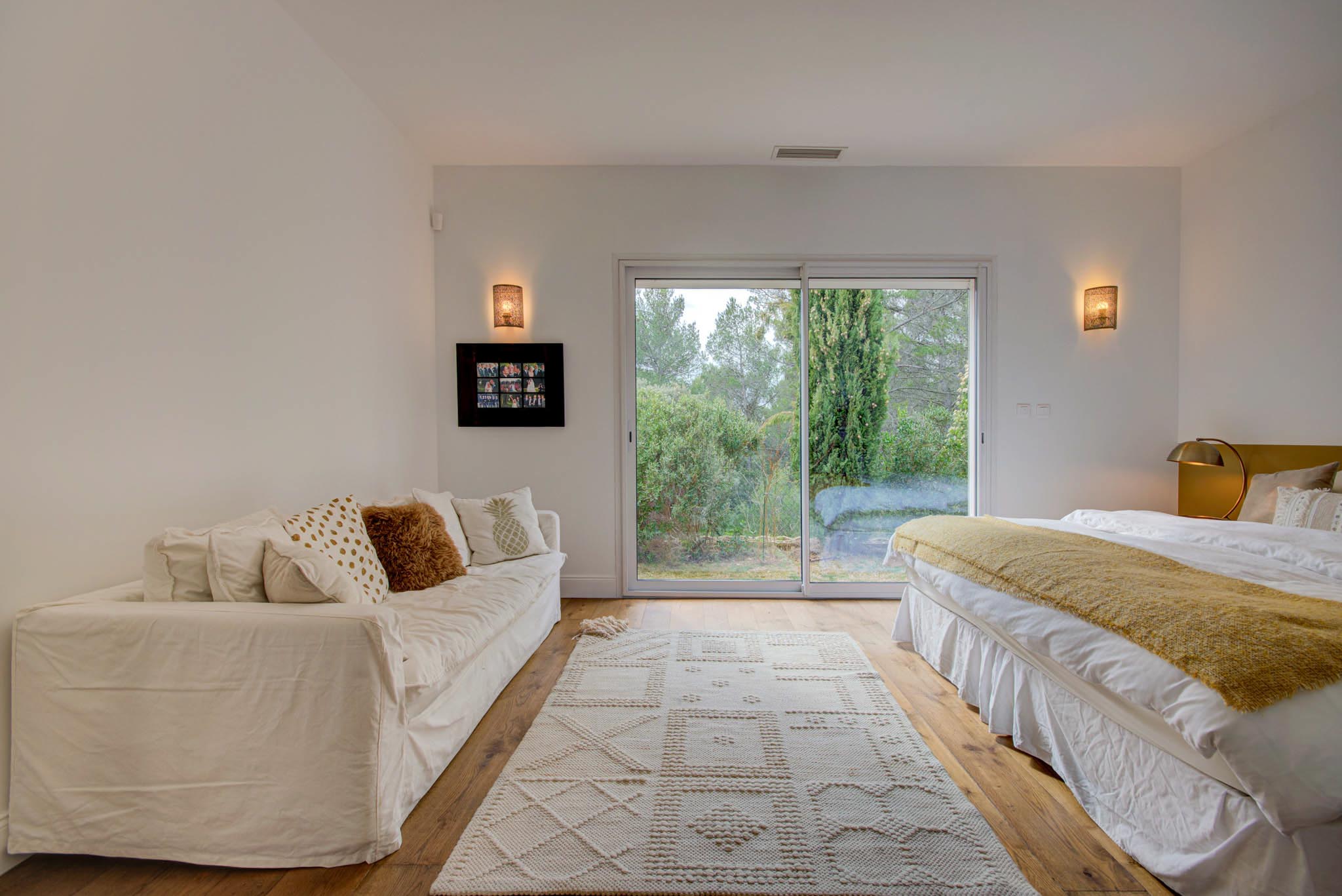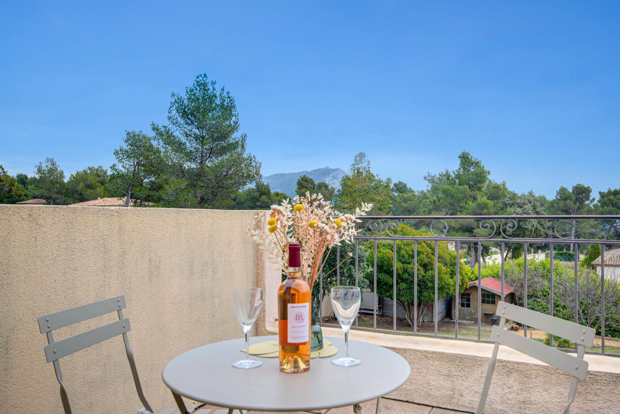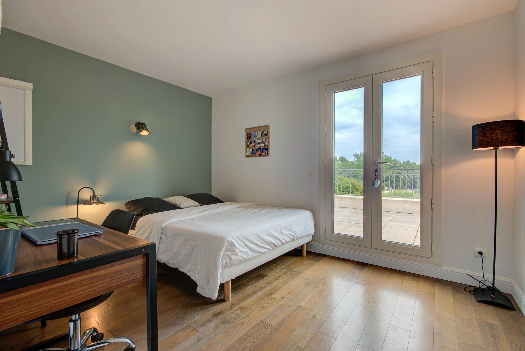 À l’étage, la chambre avec sa terrasse privative offre une vue imprenable sur la Sainte-Victoire et le parc verdoyant de la propriété, créant ainsi une atmosphère onirique et apaisante pour votre bien-être.